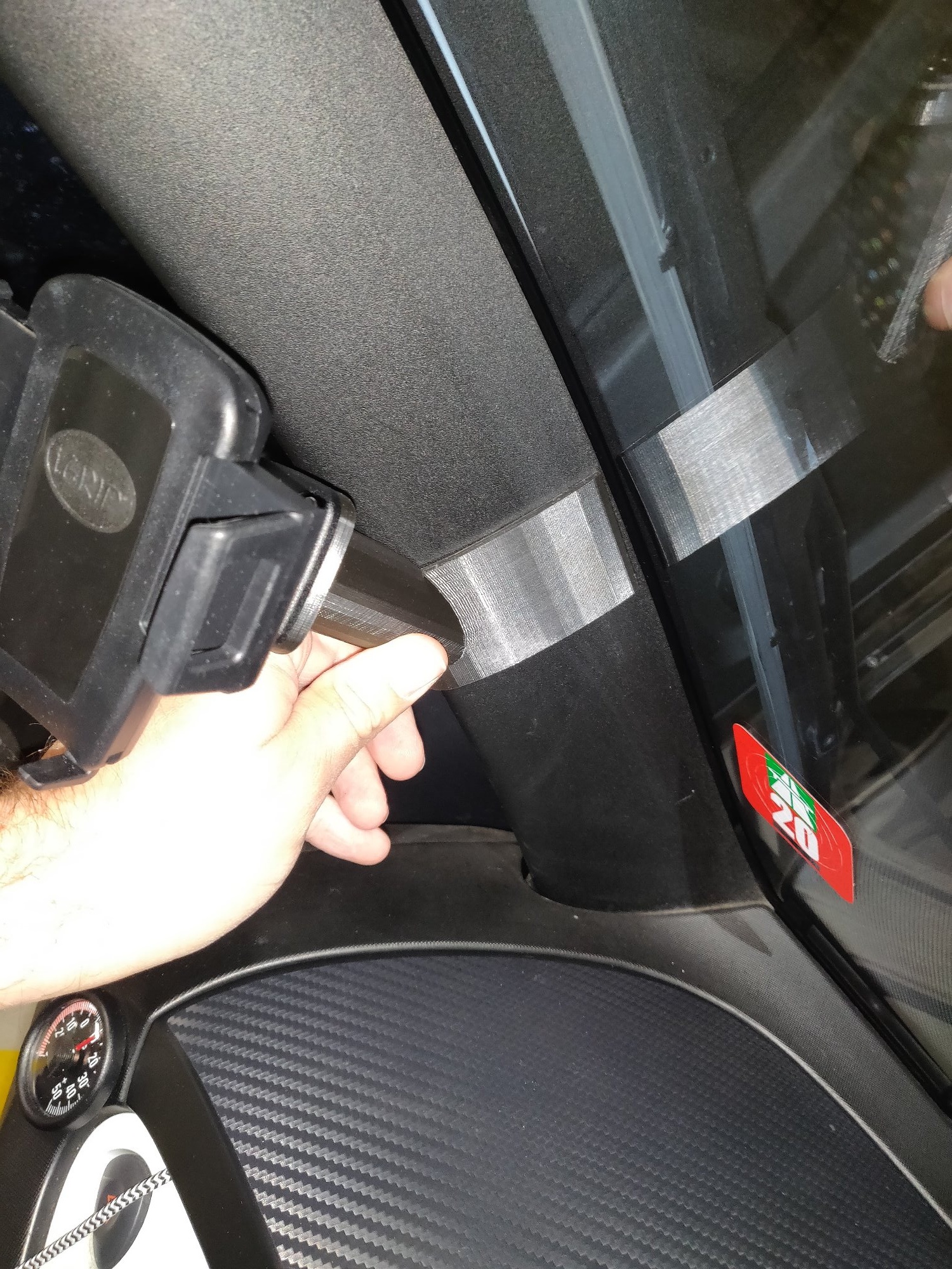 Darum habe ich die Konstruktion für mich ein wenig modifiziert und die Stange höher gelegt. Dabei habe ich auch das Profil der A-Säule ein wenig aufgeweitet, weil es zumindest bei meinem Twizy den Halter sonst auseinandergedrückt hätte.