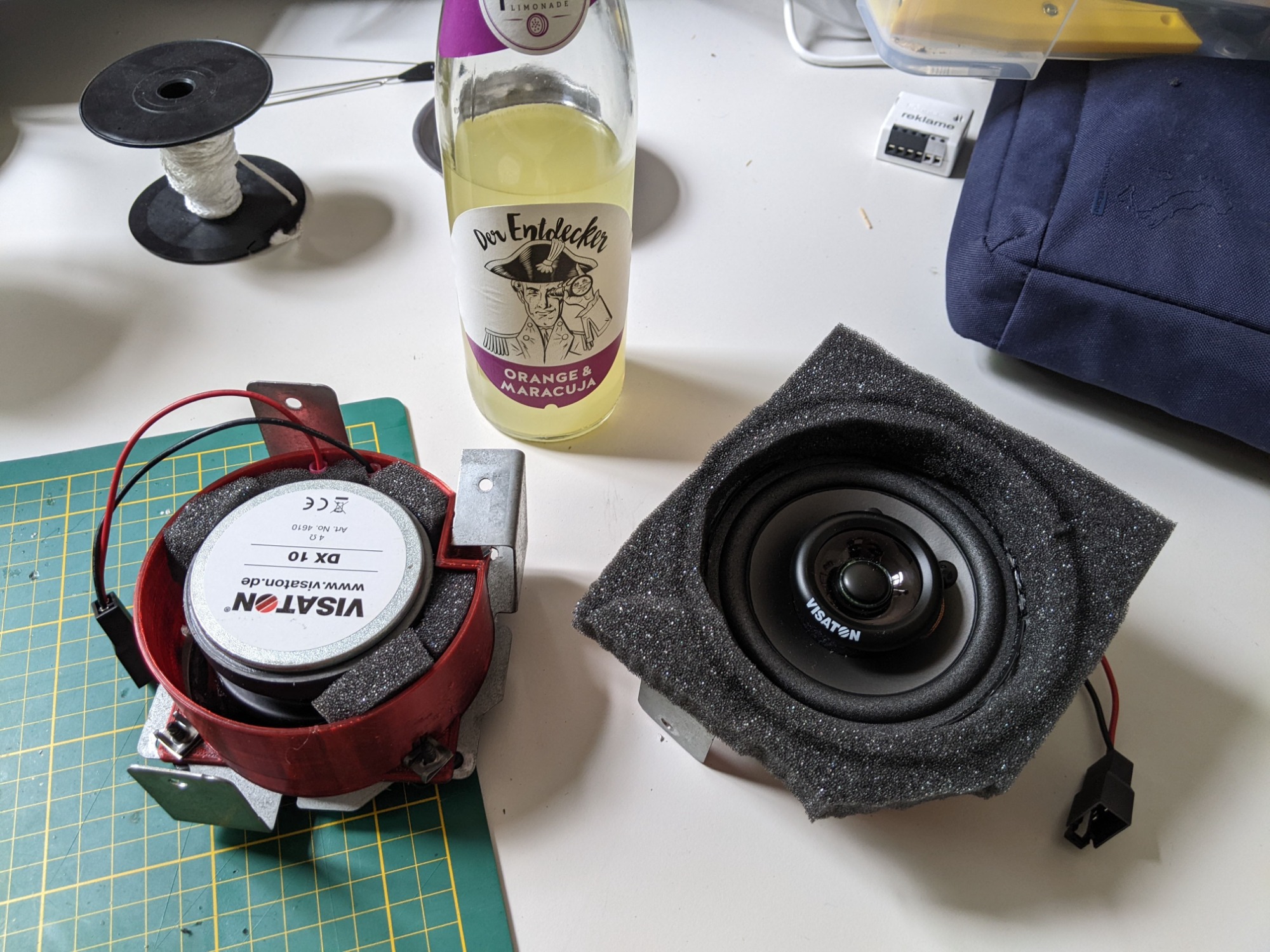 Zielführend ist es eine bestmögliche Abdichtung der vorderen Montagefläche des Speakers zu der Kunststoff Lautspecherbrücke herzustellen. zB mit einem Schaumstoffring der sich flexibel den Unebenheiten anpasst. Ich habe dafür Schaumstoffwürste genommen die es im Baumarkt zum Hinterfüttern von Bauwerksfugen gibt.