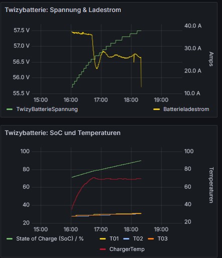 Die Temperatur sehe ich noch nicht als kritisch an, eher wenn es auch 80+ °C gehen würde. Die Leistungshalbleiter im charger können vermutlich bis 120 °C betrieben werden, da bleibt noch etwas Luft (toi, toi, toi oder knock, knock, knock).