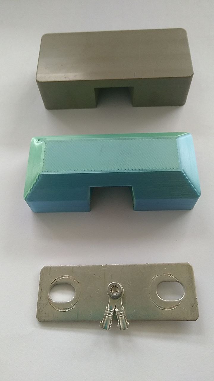 A) alternativer Halter für den Stromsensor (rechts im Bild auf der Stromschiene vom -Pol, Messleitung unten angeschlossen), in PC 3D gedruckt für hohe Temperaturbeständigkeit: