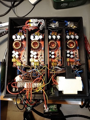 Prinzipiell scheint es zu funktionieren, wie ich mir das vorgestellt habe. Die DC-DC-Konverter behindern sich jetzt nicht mehr gegenseitig, zumindest kaum noch. Der maximale Strom muss natürlich noch richtig eingestellt werden. Weil ich auf dem Gebiet ein Dilettant bin, sollte man das natürlich auf keinen Fall nachbauen, bevor sich jemand, der sich damit auskennt geäußert hat. Dass die Li-Ionen-Akkus problematisch sind, ist mir bekannt. Wenn es mal bessere gibt, werde ich sie austauschen. Durch die zusätzlichen vielen Displays gibt es ein schönes Kabelknäuel.