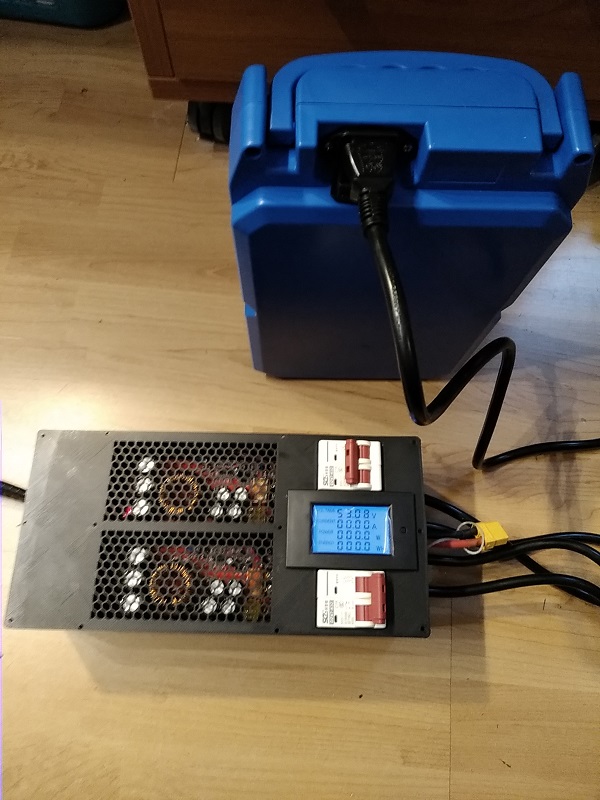 Der XT90-Anschluß geht zum Ladegerät, die vier dicken Kabel gehen zu den Akkus. Damit ich das Rangeextenderladegerät (13S) nicht mit dem Twizy-Ladegerät (14S) verwechsle, hat der Twizy einen Anderson-Stecker. Zwischen Sicherungen, Ladeanschluss und DC-DC-Stepup-Konverter befinden sich zwei Brückengleichrichter, so sollte es auch kein Problem geben, wenn die Akkus mal unterschiedlich voll angesteckt werden.