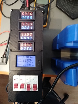 Aufgeladen habe ich ihn heute mit 8 A, also 1 A pro Zelle. Er blieb dabei eiskalt. In den leeren Akku gingen 735 Wh. Die Zellen habe ich so sortiert, dass alle 52 Reihen der vier Akkus die gleiche Kapazität haben. Es sollten am Ende dann doch ca. 2,9 kWh zusätzlich zur Verfügung stehen, also die 100 km müssten locker zu schaffen sein,