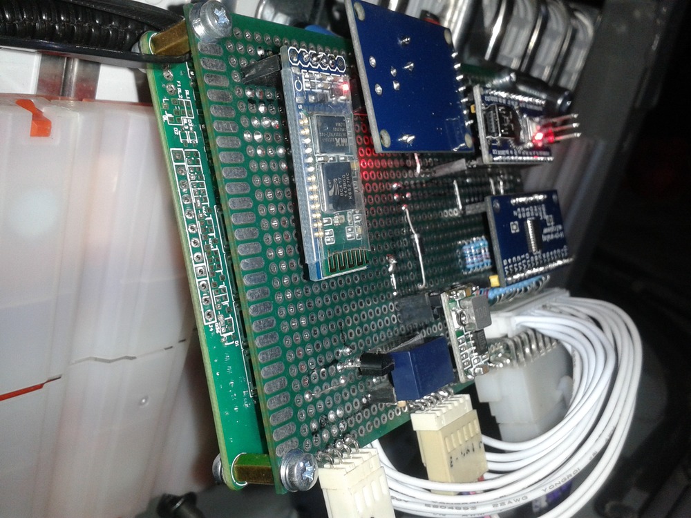 Double Layer Platine oben unsere Ardu-sachen, unten 14S Balancer. Alles (außer Widerstände) auf steckleisten montiert. Falls wenn etwas kaputt ist, kann ich problemlos austauschen.