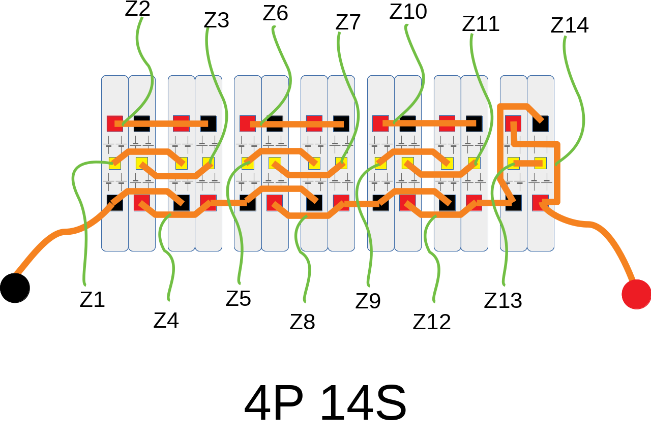 Aber gerade dann bringt ein 4P-Layout auch eine höhere Lebenserwartung, weil es die Zellen besser stabilisiert. Dass Du mit der Verschaltung nur noch 14 Makrozellen bekommst ist der Sinn der Sache. Je mehr Zellen Du parallel schaltest, desto stärker werden die, und desto weniger Aufwand hast Du mit der Überwachung. Aktuell schaltest Du nur zwei Zellen parallel (die in den Modulen bereits parallel sind).
