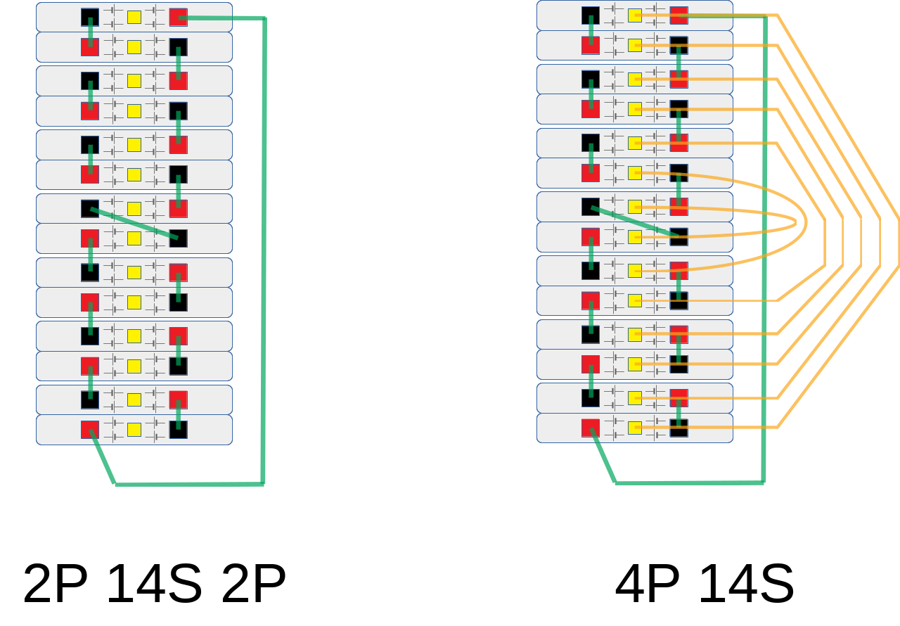 Die Module der neuesten Generation scheinen symmetrisch zu sein, jedoch sind dort immer 2 Module in einem Blechgehäuse verbaut, was zur Folge hat, dass eine 4P 14S Verschaltung nur mit besonderen Zellverbindern möglich ist.