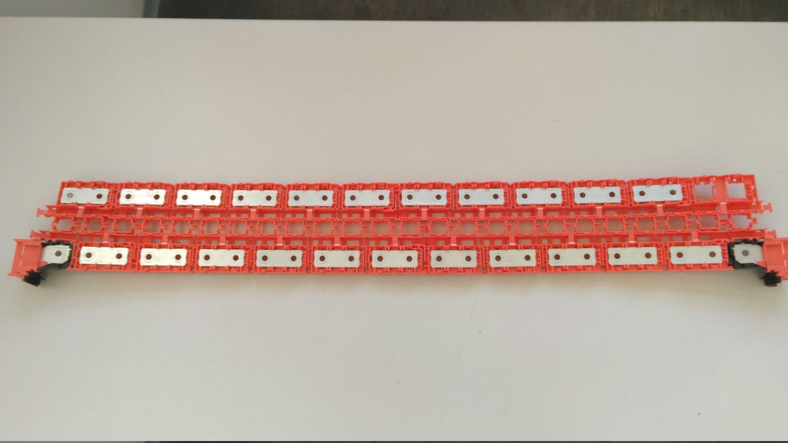 Die Akkubox wurde maßlich so gefertigt, dass die 21 Akkumodule in Fahrtrichtung spielfrei hinein passen, d. h. die Box hat ein lichtes Innenmaß von 21 x 34 mm = 714 mm.