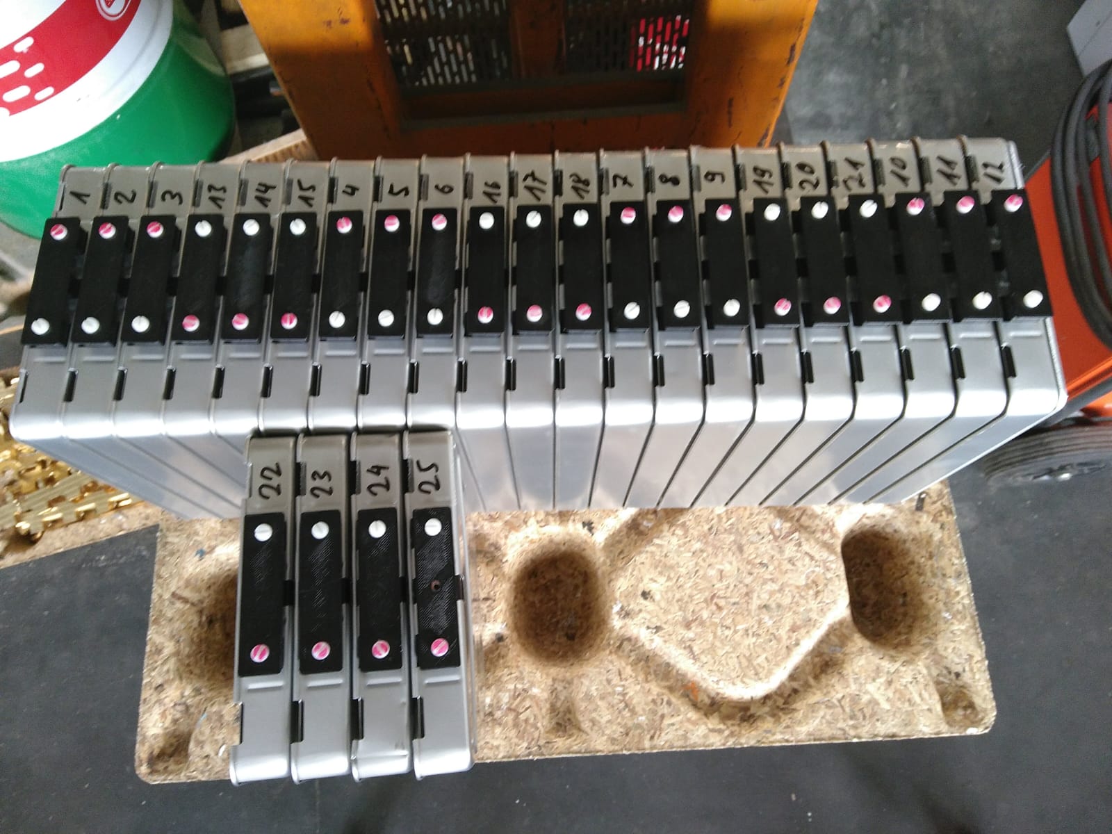 Gegen seitliches Verrutschen in der Box sind die Module auf 4 Aluminium-Rundstäbe, Durchmesser 9 mm aufgefädelt, von denen 2 jeweils stirnseitig mit dem Boden der Akkubox mit M5-Schrauben verbunden sind.