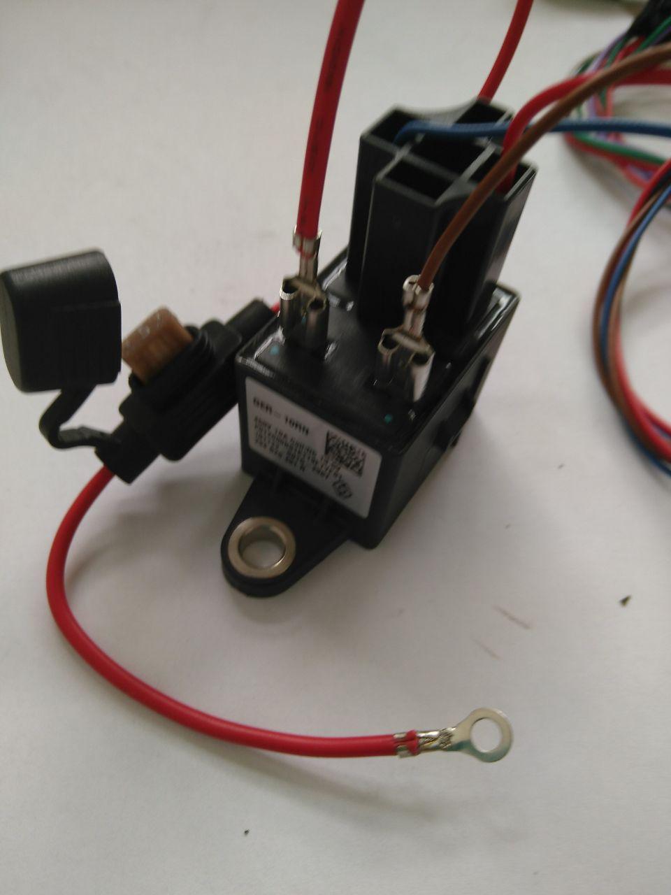 Wenn man die rote Leitung mit dem Sicherungshalter und die braune Leitung aus dem Stecker ausklinkt, dann kann der Stecker mit den verbleibenen beiden Anschlüssen auf das Relais für den Sevcon gesteckt werden.