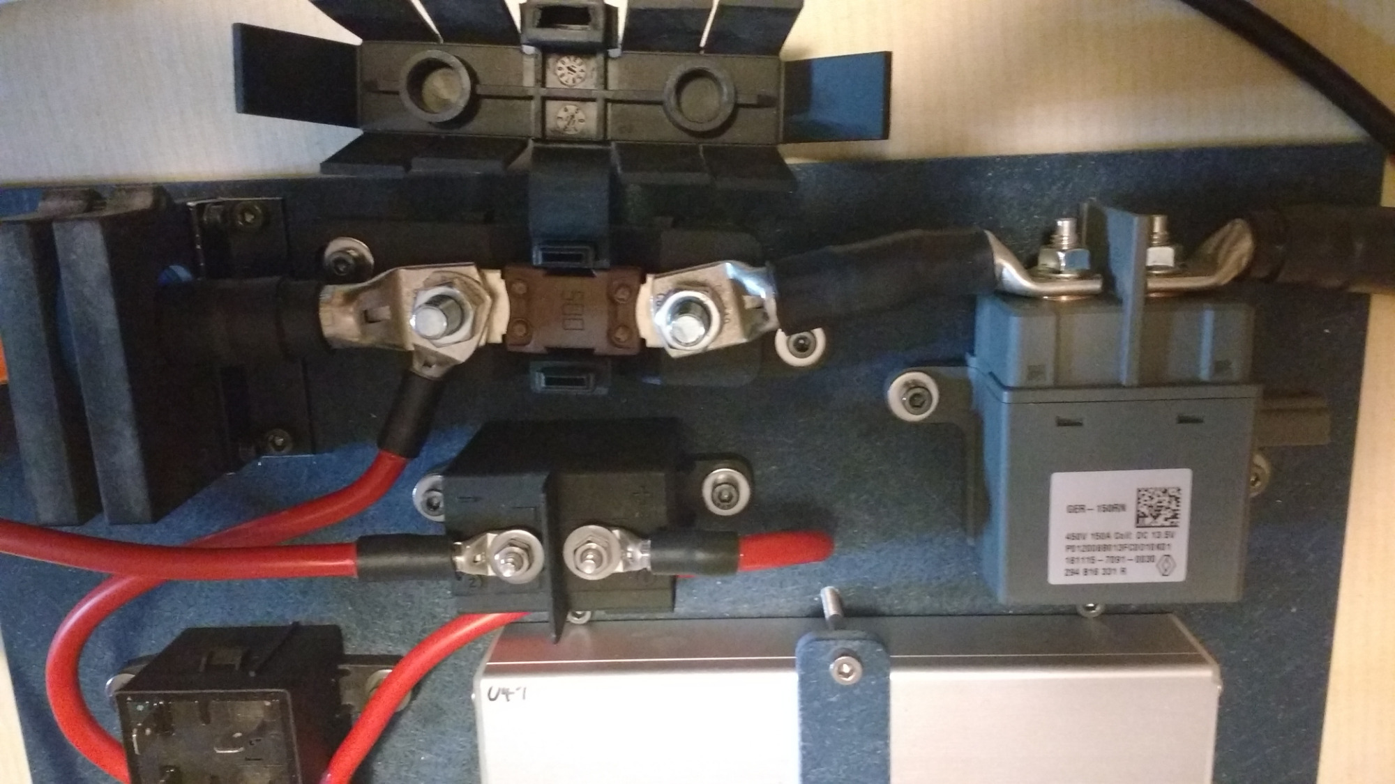 Analog dazu verbinde + des Laderelais mit dem +-Anschluss der Ladestecker und das - des Laderelais mit einem Anschluss des 50A-Sicherungshalter, oder umgekehrt.