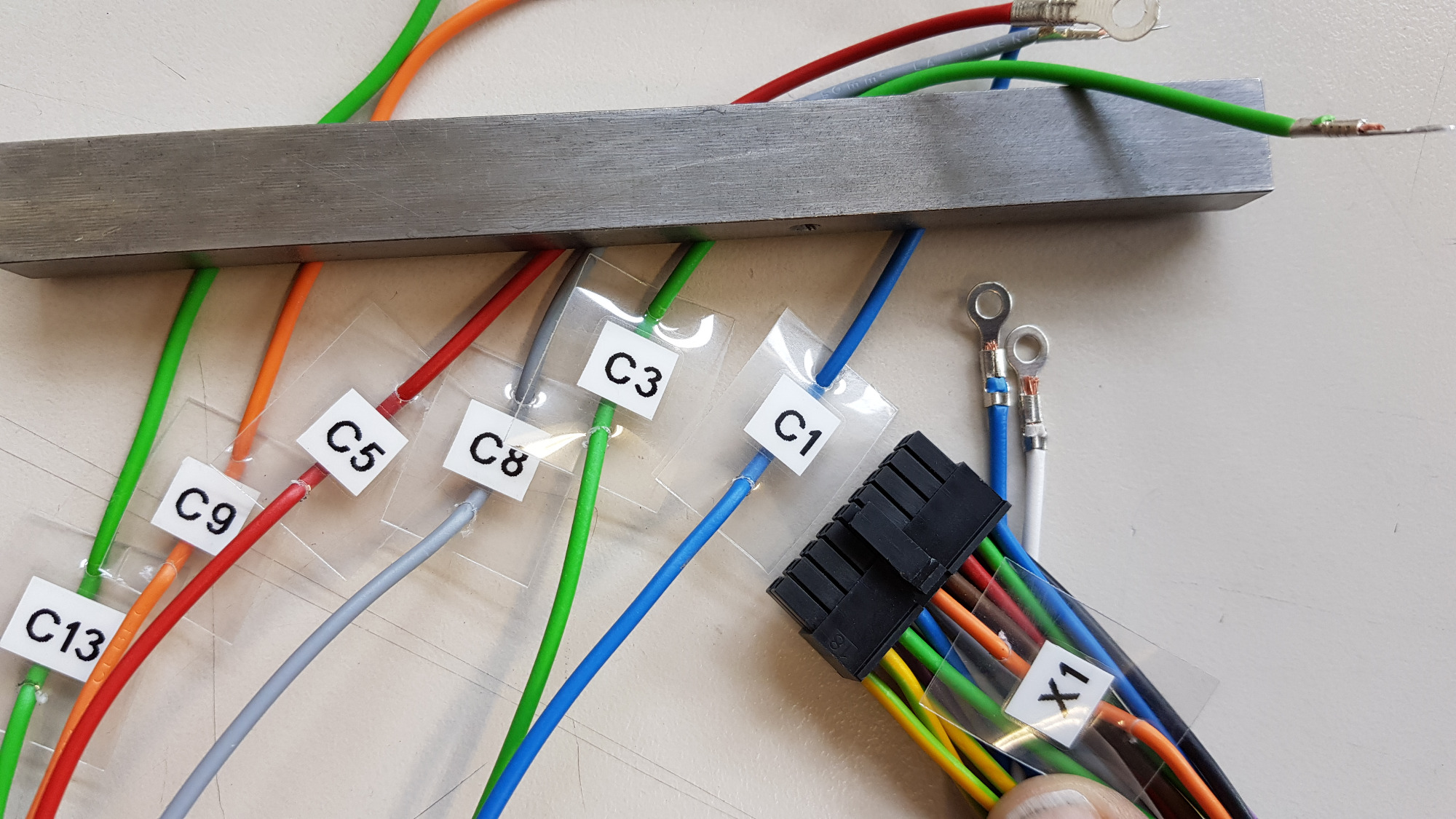 Um Fehler beim Anschluß möglichst auszuschließen, habe ich mir Labels gedruckt, einlaminiert, ausgeschnitten und auf die entsprechenden Leitungen aufgefädelt bzw angedrahtet. Vermutlich gibt es dafür auch professionelle Lösungen zu kaufen, da mir aber keine bekannt war, habe ich die DIY-Lösung gewählt.