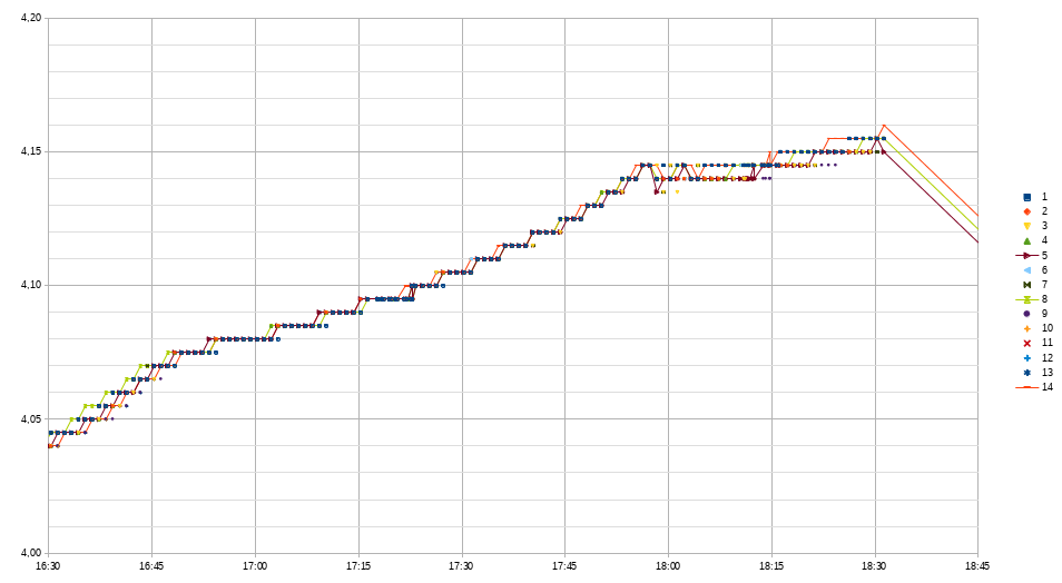Das sieht unverdächtig aus, Zelle 3 ist komplett unauffällig. Zellen 5, 8 und 14 teilen sich die "Führung", Zelle 8 im Bereich 4,05 - 4,10V, zum Schluss dann Zelle 14. Aber mit minimalen Abweichungen, die Zellspannungen sind alle nah beieinander. Auch bei den Standardabweichungen bestätigt sich das.