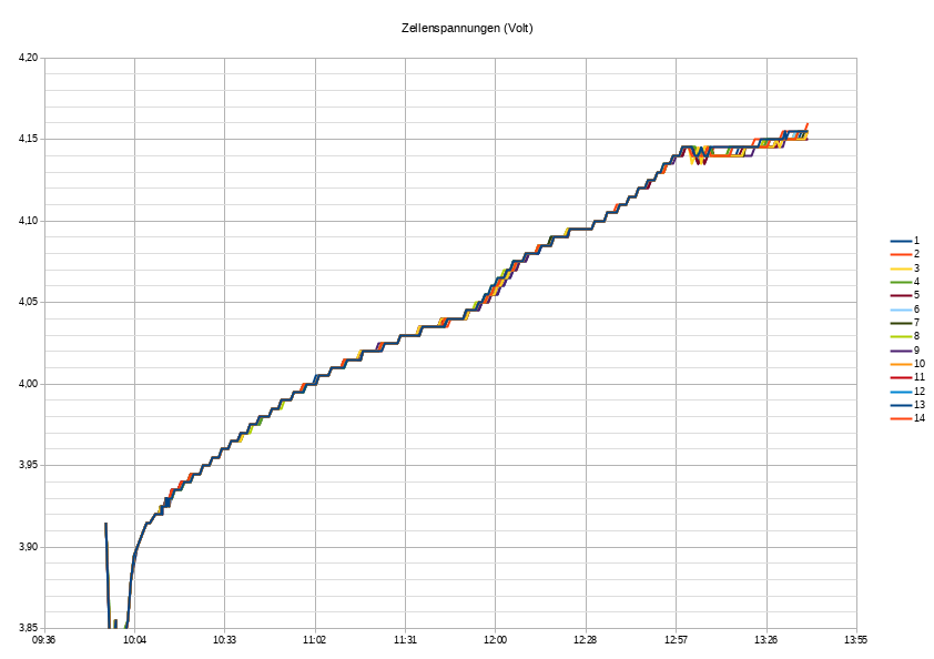 6 1691Die Zellen brauchen also sehr unterschiedliche Behandlung, und das BMS erkennt das sehr zuverlässig (siehe Spannungsverlauf).