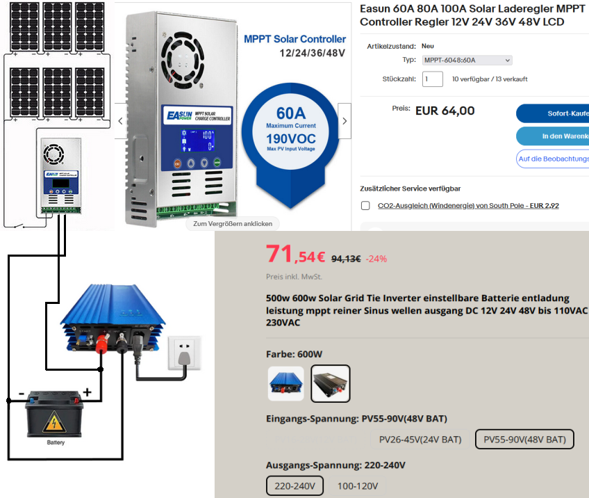 Anstelle des Grid-Tie-Inverters kann man auch (parallel an die Solarbatterie) einen anderen (Insel-)Inverter anschließen, den ich sowieso schon habe. Damit muss aber DC in AC und im Twizy wieder AC in DC umgewandelt werden.