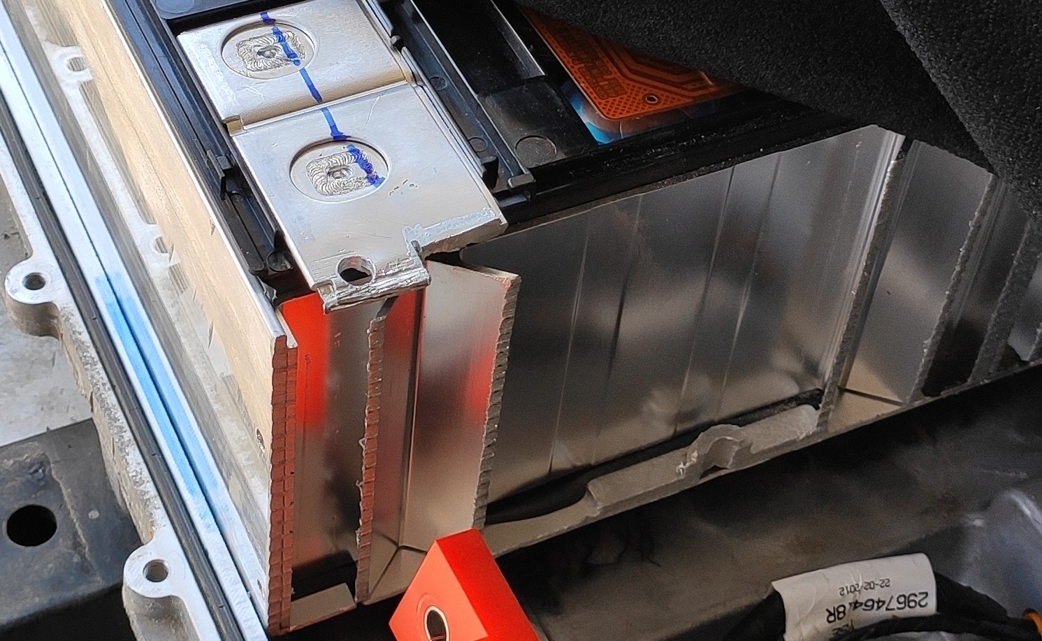 Die beiden Schweißpunkte der Alukontakte beim Akku mit Kupferstück liegen in einer unteren Lage und sind etwas weiter vom Rand weg. Der Aluanschlussbereich ist ca. 2mm flacher und die Schweißstellen sahen komisch aus, das dürften die Reste der angeschweißten Platte sein.