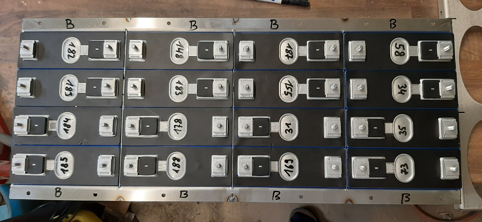 So gibt es keine punktuelle Belastungen auf die Zellen, auch werden die mechanische Kräfte der Aufhängung über den Stahlrahmen abgeleitet. (Edel)stahl, weil ich das mit sehr wenig Hitzeeintrag schweißen kann und die Wärmeleitfähigkeit etwa 15x niedriger als von Alu ist. So kann man mehr oder minder "direkt neben der Zelle" schweißen, ohne die dortige Isolierung zu beschädigen.