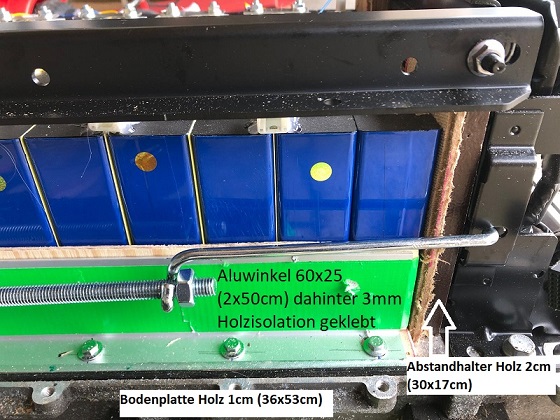 Die Zellen habe ich gepresst so gut es geht. Schätze 30-40kg habe ich bestimmt hin bekommen. Kann mir nicht vorstellen dass mehr Sinn macht, da ja die oberen Schienen nur mit kleinen Muttern geklemmt sind und somit eh nicht soooo viel mehr halten würden. (Spekulation!). Erst DANACH die Zellverbinder anbringen - logisch.