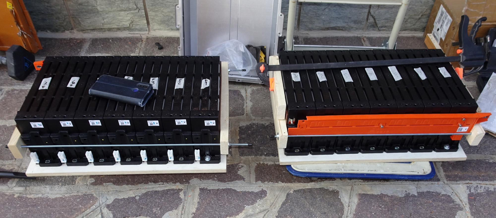 * neue Zellen inkl Isolierplatten rein stellen, seitliche Aluschiene einpassen(10min), und zusammendrücken/pressen