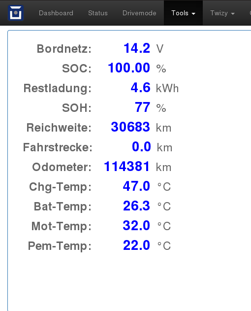 Vierstellige OVMS-Reichweitenanzeigen sind bei mir die Regel, momentan 2868 km, fünfstellig kommt eher selten vor.Snorre schrieb: Man beachte die Reichweitenprognose vom OVMS: