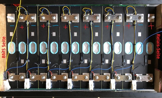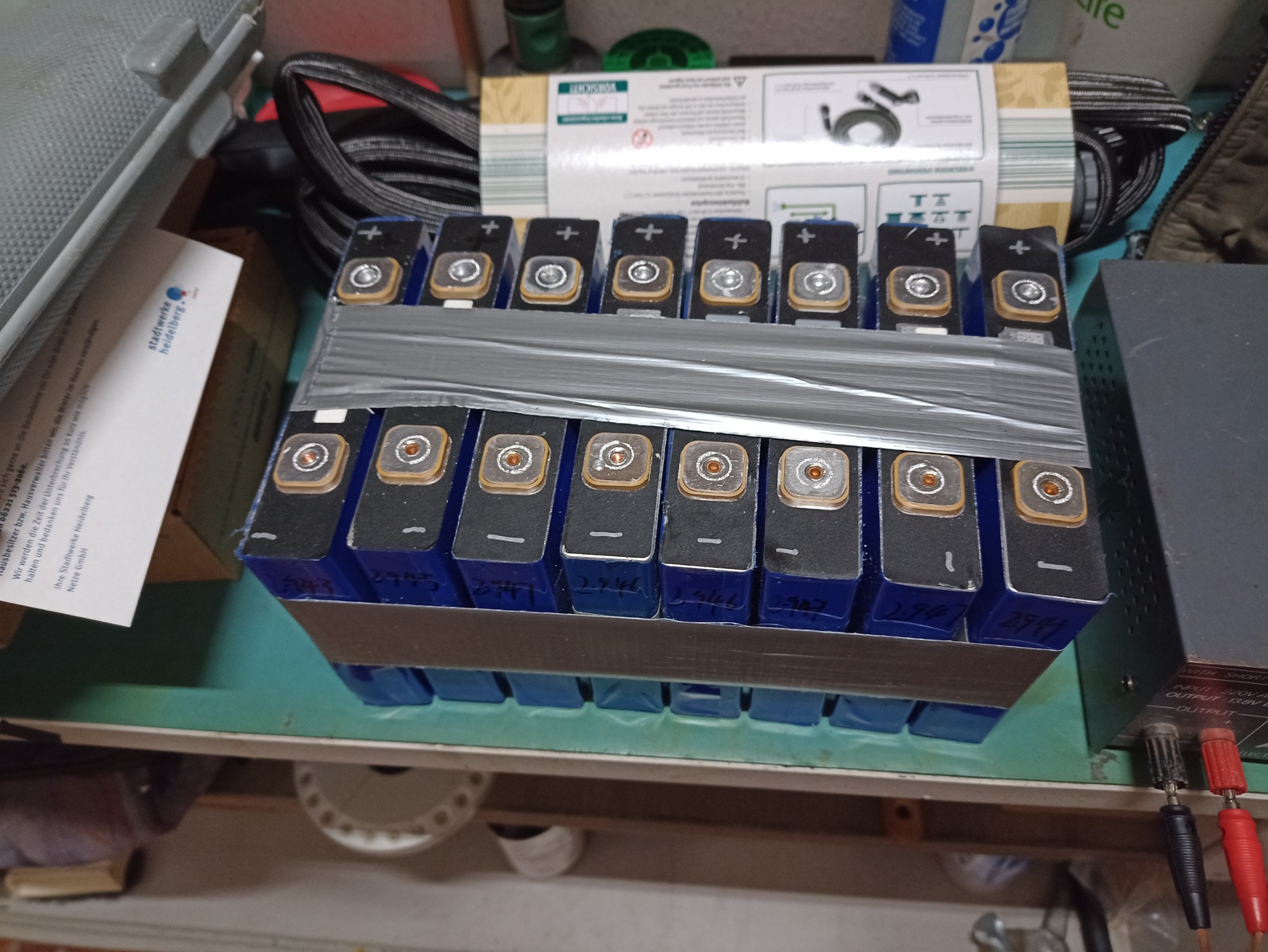 Ich habe hier einen Block 50Ah Zellen, die in einer Wanroy 12V Batterie waren. Die wollte ich zu einem 50Ah 24V Pack umbauen.