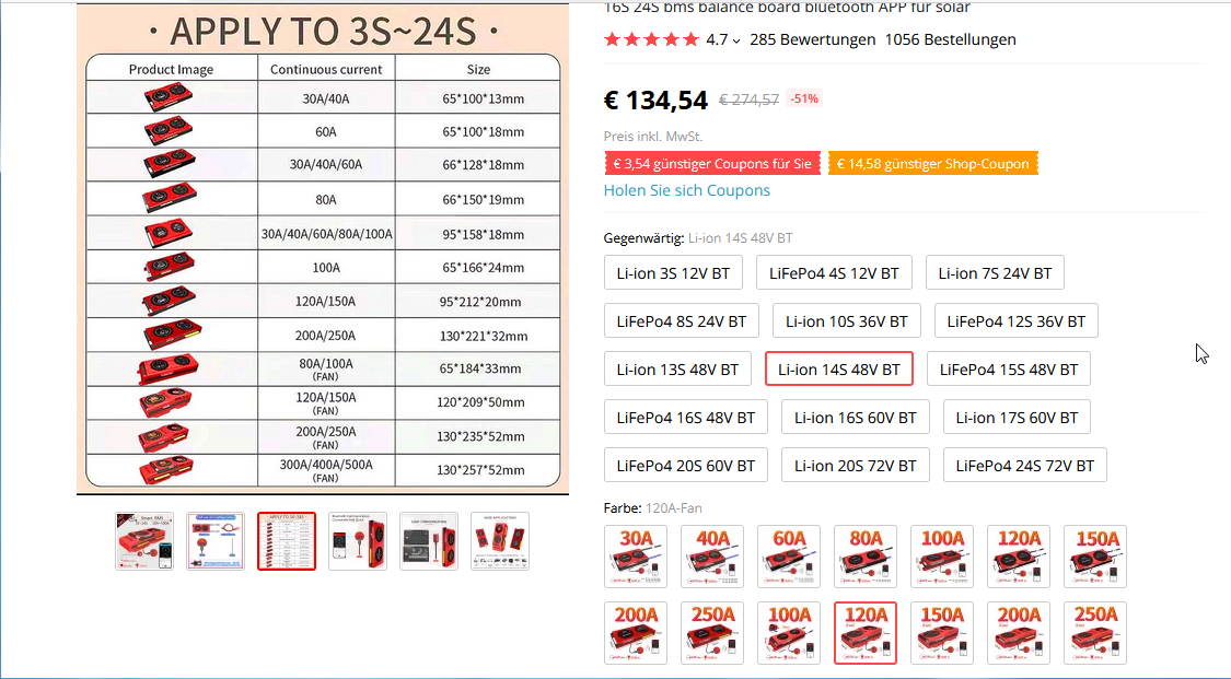 Das ist ja mal ein geniales BMS, frei konfigurierbar. Das aktive Balancing ist gut für LiFePos, die driften ab werk mehr als Liion, hatte mir früher mal schlaflose Nächte gemacht, als es keine aktiven Balancer zu kaufen gab wollte ich selber einen konstruieren. Bis ich merkte, das LiIon eigentlich gar nicht driften. Meine Schwester hat ein E-Bike mit zwei Akkus, die haben gar keinen balancer. Mich traf der Schlag, als ich die aufmachte. Seitdem laden die nur draussen in einem Blecheimer... Halten aber immer noch