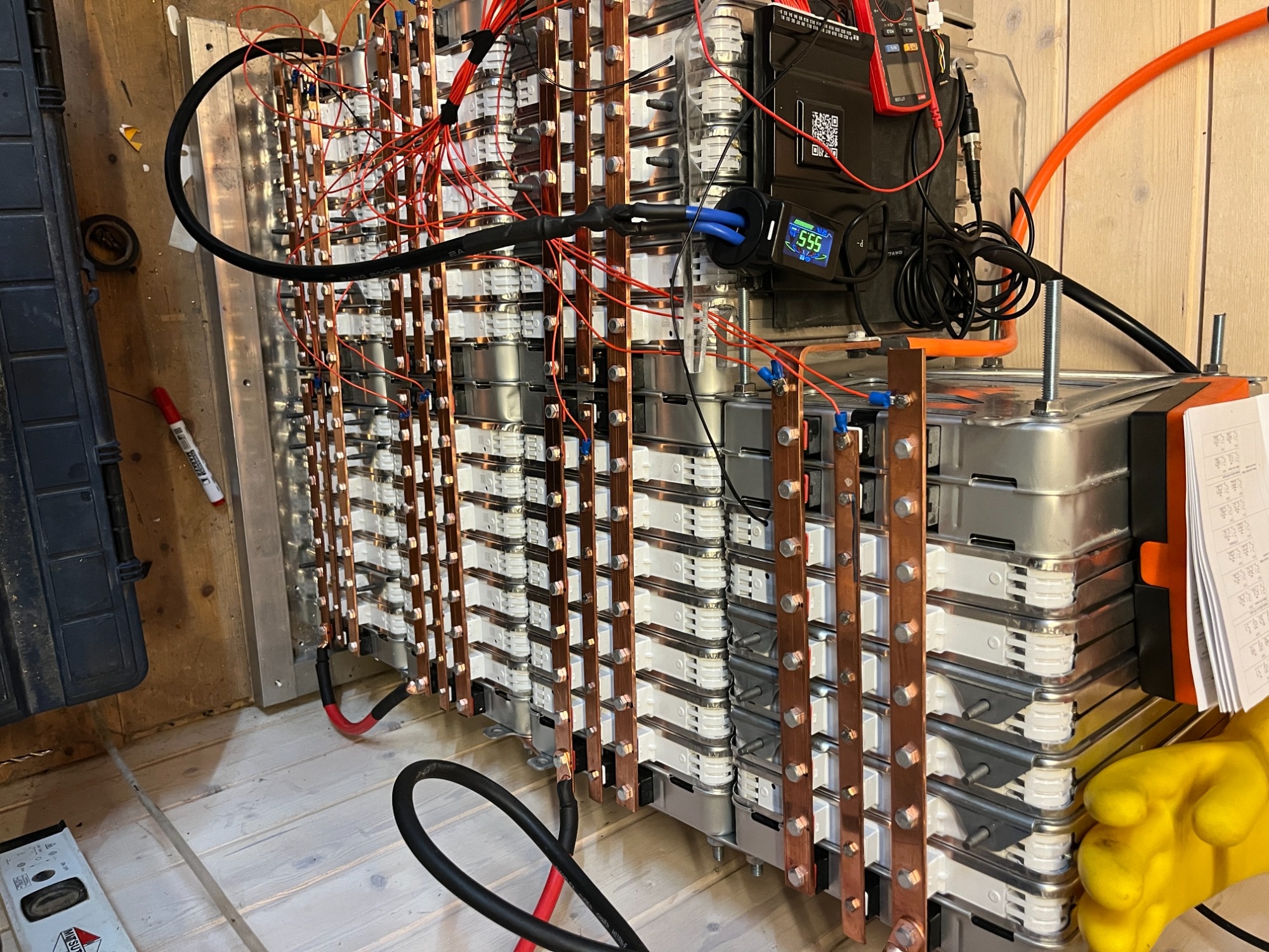 Hier ein Bild von Batterie Nr 1. als ich noch am bauen war. Seit das Bild aufgenommen wurde habe ich die Busbars abgedeck und das BMS Kabelsalat aufgeräumt. Hinter und neben beide Batterien habe ich eine Brandschutzplatte (aus dem Kamin-bereich) angebracht.