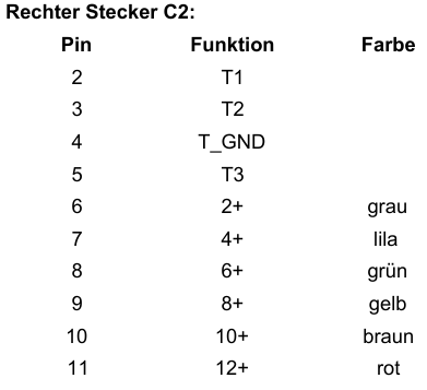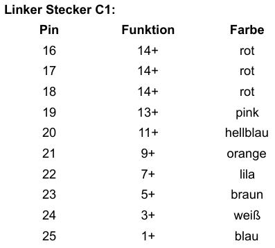Das Kabel an Pin 11 ist mMn rot/grün und über die Belegung der 3 roten Kabel an den Pins 12 -14 ist nichts bekannt.
