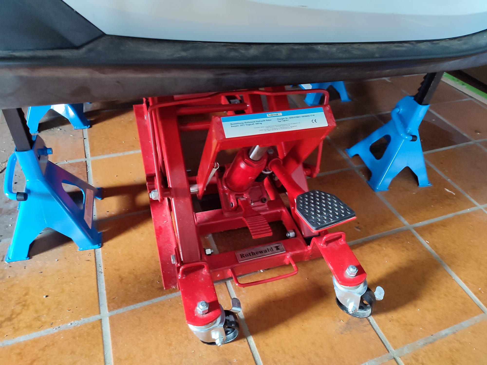 Den Twizy habe ich auf 4 Unterstellböcke gepackt, angehoben hab ich ihn einem Hydraulik-Wagenheber.