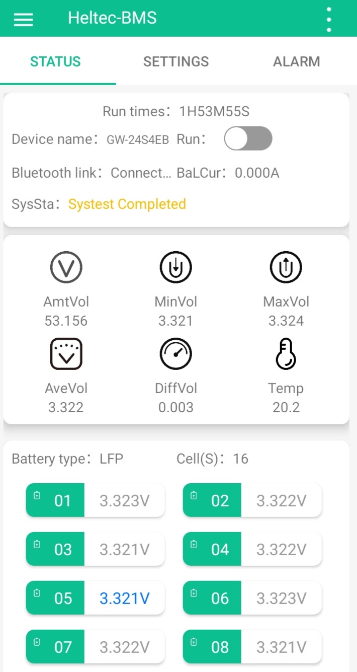 Werte müssten jetzt passen, "Invert Current Sensor" ist jetzt auf "0", was definitiv stimmt, habe heute voll geladen, da war die Spannung positiv, Verbrauch ist dann negativ, das passt auf jeden Fall, Alle anderen Werten habe ich nach besten wissen, aufgrund des Datenblatts von CATL eingegeben.