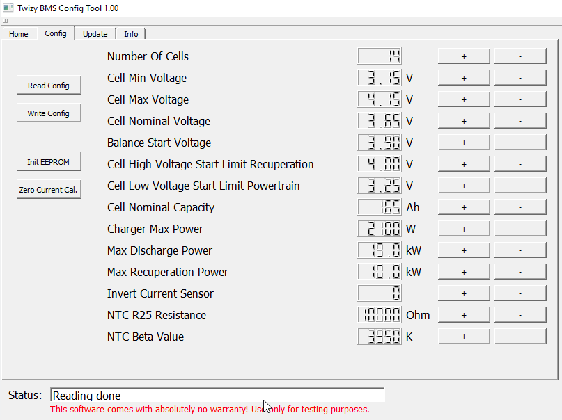 Ich würde dir also empfehlen Cell High Voltage Start Limit Recuperation, Cell High Voltage Start Limit Powertrain und Max Recuperation Power etwas defensiver, und natürlich an deine LiFePo Zellen angepasst, einzustellen.