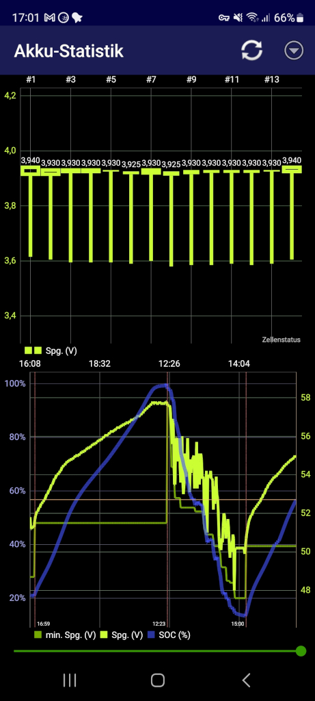 Wenn ich mir das Video anschaue, sehe ich da bei den Zellenspannungen nur sehr geringe Abweichungen, so wie sich das für einen Akku mit 100% SOH gehört. Zum Vergleich zeige ich dir mal zwei Bilder von meinem Akku mit 81% SOH: