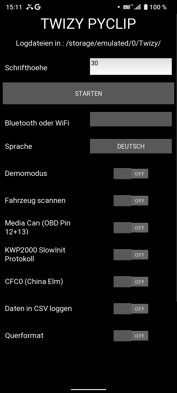 Selbst dann, wenn ich den Speicher und den Cache der Twizy-App lösche oder gar die App deinstalliere und danach wieder installiere ist das Feld anschließend mit "OBDII" vorbelegt.