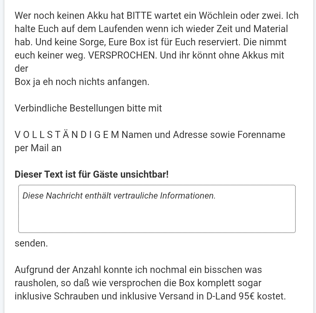 TwizyWombat schrieb: Ich sehe auch die E-Mail Adresse nicht. Wollte das nur kurz mit einwerfen. Da meine CALB'ies noch irgendwo auf einem Containerschiffchen gut verstaut sind halte ich mich zurück und schreib dir dann in 1-2 Wochen. Danke auf alle Fälle schonmal