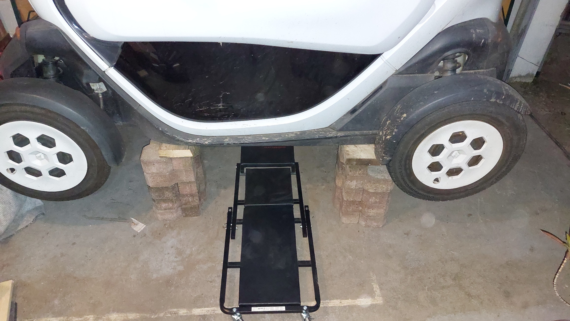 Twizy aufgebockt. Darunter Werkstatt-Rollliege, um etwas komfortabler an die Steckverbinder und Schrauben zu gelangen.