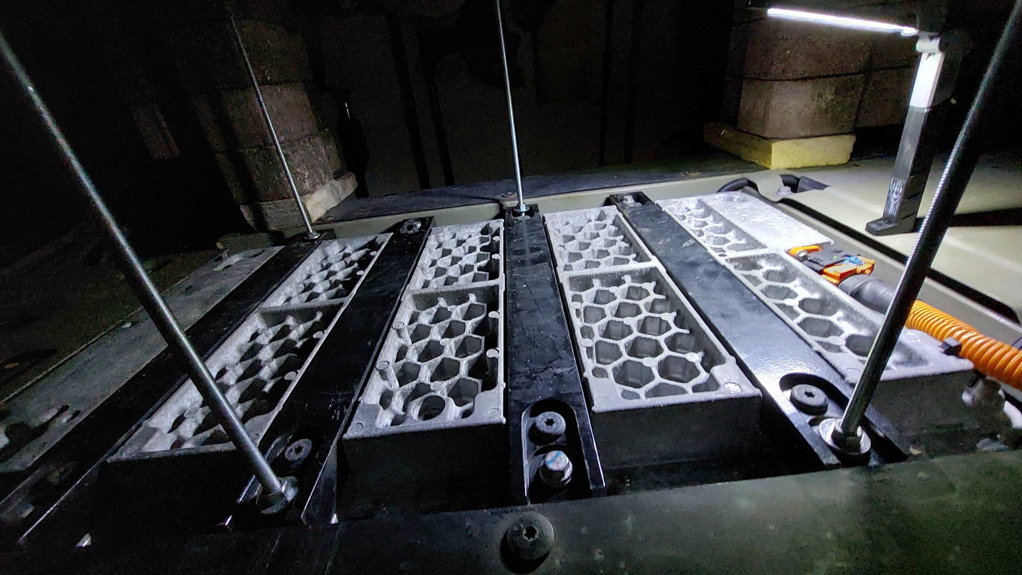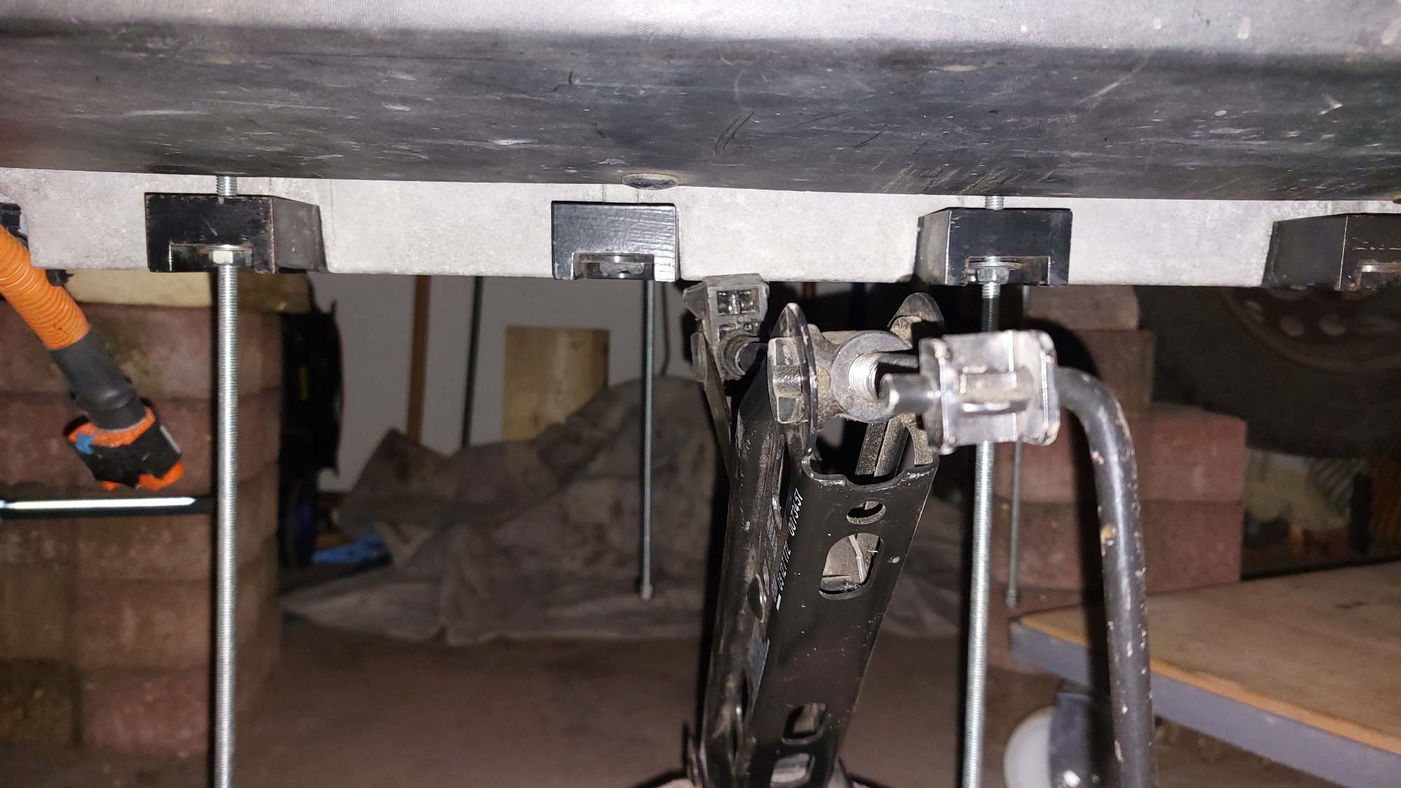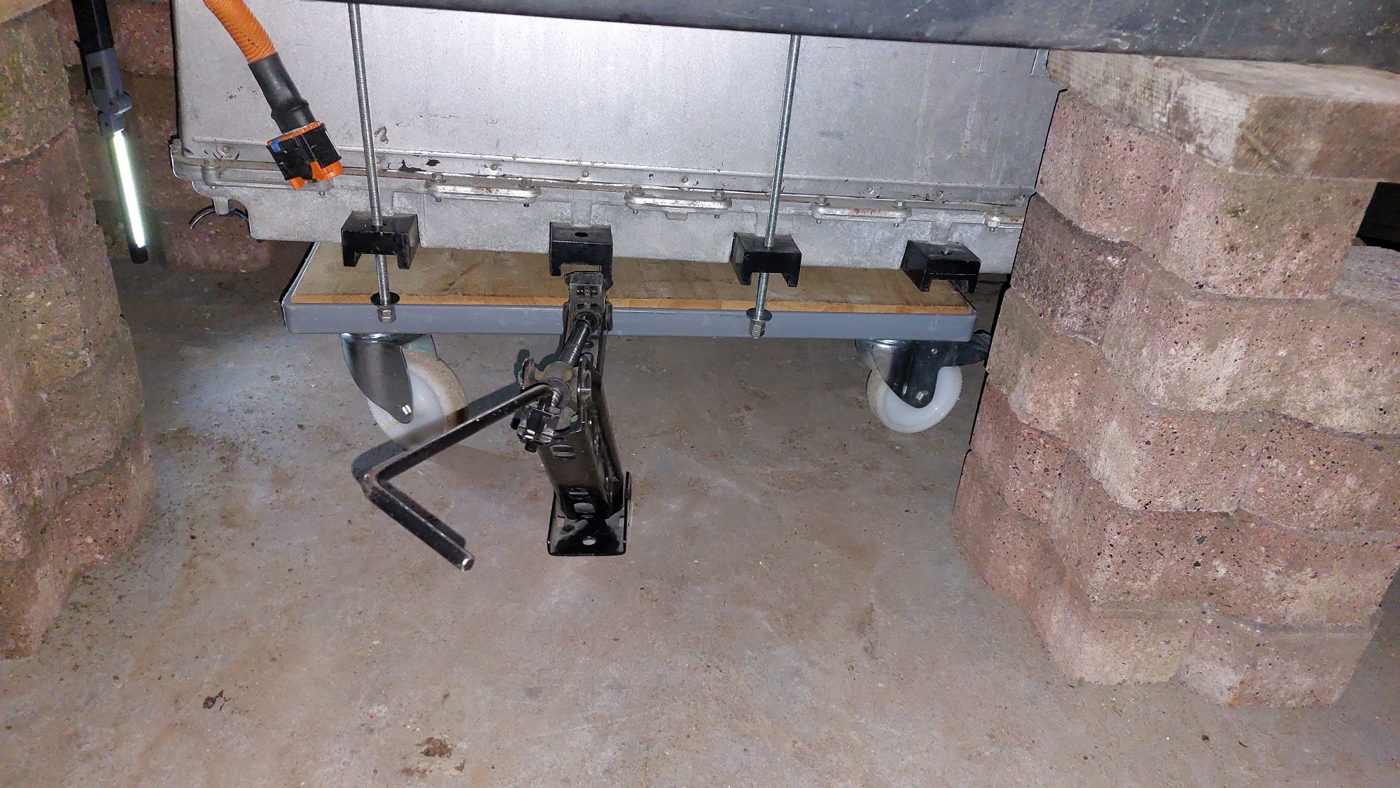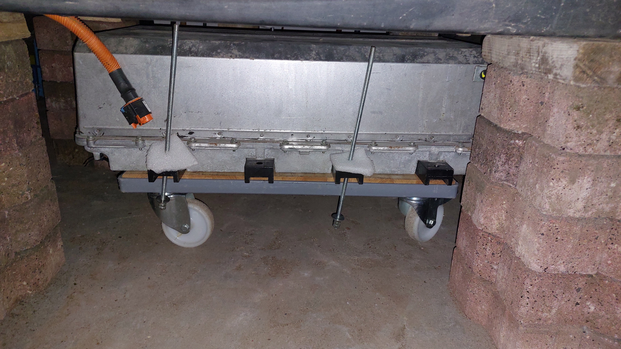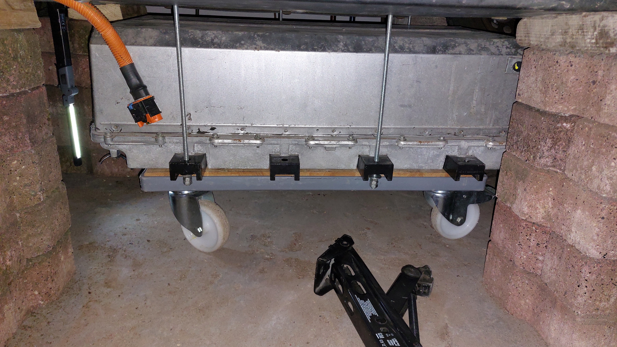 Deshalb habe ich mir nun folgende Low-Cost-Alternative für den bei mir wiederholt erforderlichen Aus- und Einbau des Akkus überlegt: von den 8 haltenden Gewindeschrauben des Twizyakkus werden 4 Stk. entfernt. Stattdessen kommen dort 4 lange M8-Gewindestangen hinein, auf die mindestens je eine Mutter aufgeschraubt ist und die fast bis auf den Boden reichen. Dann werden die anderen 4 Akkuschrauben entfernt. Der Akku hängt dann nur noch an den Gewindestangen und kann durch sukzessives herunterschrauben der 4 Muttern auf ein Rollbrett abgelassen werden. Abschließend werden die Gewindestangen ausgeschraubt und der Akku kann unter dem Twiizy herausgeschoben werden.