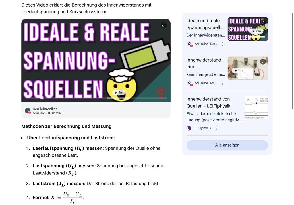 Die Ki suche zur Ermittlung des Innenwiderstands einer Spannungsquelle ergibt: