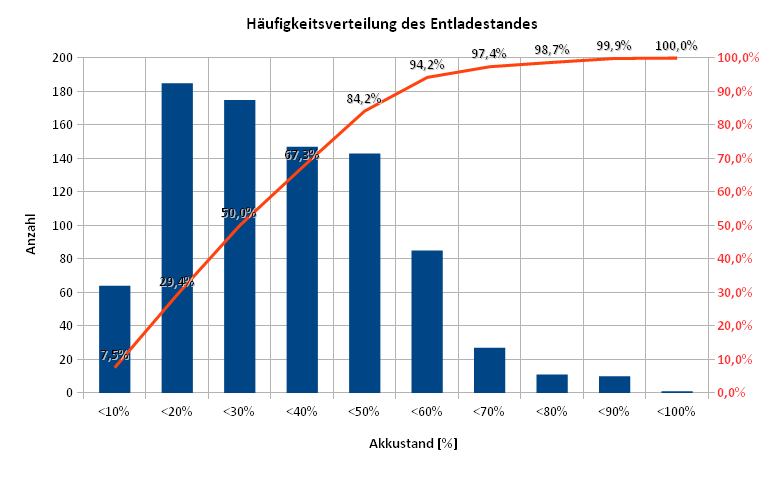 Das inspirierte mich zu einem neuen Diagramm "Häufigkeit des Entladestandes" also bei welchem Akkustand habe ich wieder aufgeladen. Hier ist gut zu sehen, dass ich zwar gerne den Akku auch mal leer fahre (in 50% aller Fälle ist der Akkustand kleiner 30%) aber die eigentlich mögliche Reichweite nicht ausnutze.