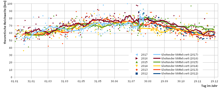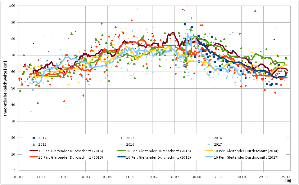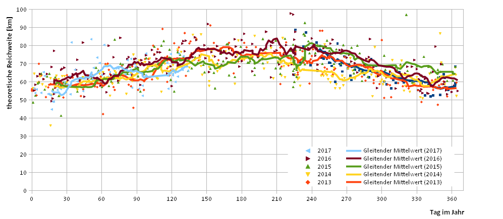 Die 20er Durchschnittsreichweite folgt zwar noch der 20er Durchschnittstemperatur, liegt aber deutlich darunter.