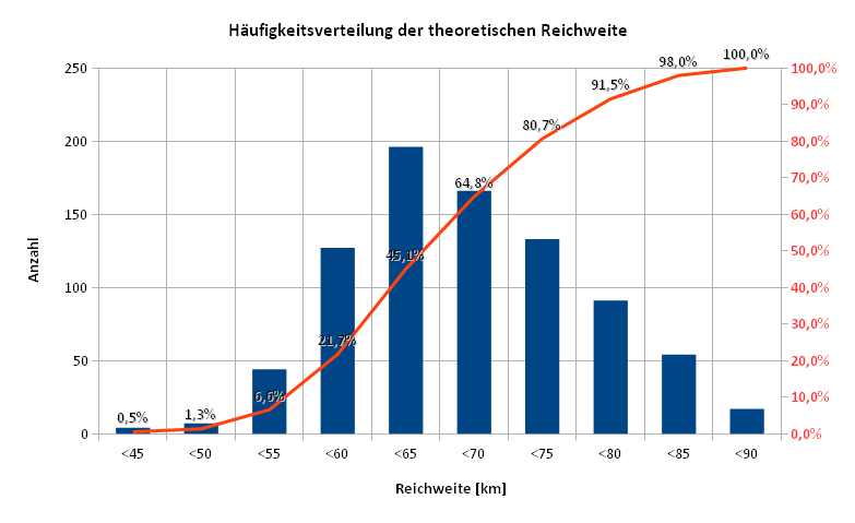 Ein weiteres neues Häufigkeitsdiagramm zeigt die Verteilung der theoretischen Reichweiten auf Basis der linearen Extrapolation der gefahrenen Kilometer je Akkuentladung (also z.B. 20% Restakku und 50km gefahren = 50/0,8 = 62,5km theoretische Reichweite) . Diese Verteilung zeigt deutlich die extreme Streuung der Reichweiten aufgrund der bekannten Parameter wie Außen-Temperatur, Regen, ... aber auch dass ich von der Renault-NEFZ-Angabe 100km weit entfernt bin