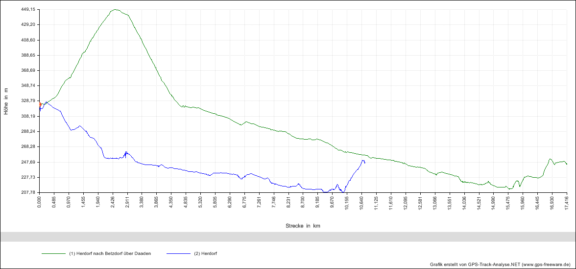 Der Vergleich der beiden Strecken zeigt den Streckenunterschied mehr als deutlich sowohl in Länge, als auch vor allem in den Höhenmetern!