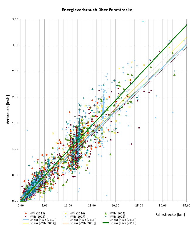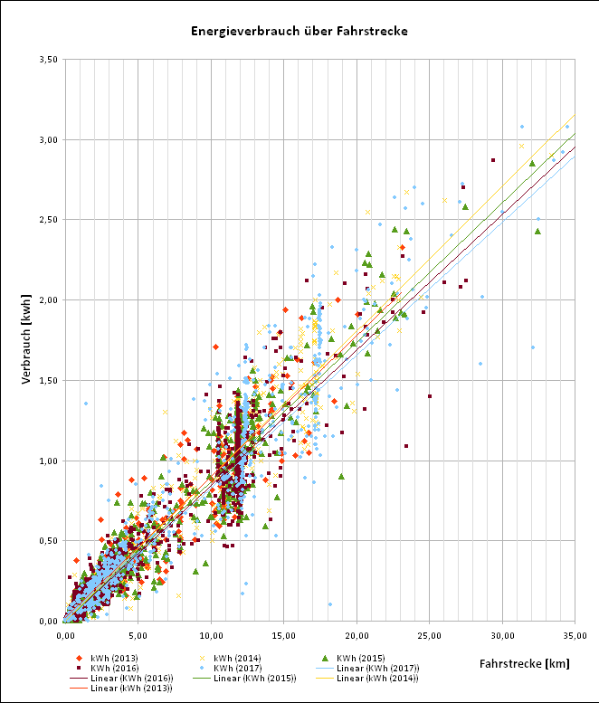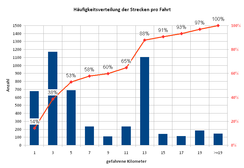 zum Schluss habe ich mir (mal wieder) noch ein neues Diagramm ausgedacht, bei dem ich die gefahrene Strecke in Relation zum verbrauchten Akkuanteikl aufliste. Sehr deutlich ist die breite Streuung zu sehen, einen Schwerpunkt auszumachen erscheint mir bei der Datenwolke aber etwas gewagt.