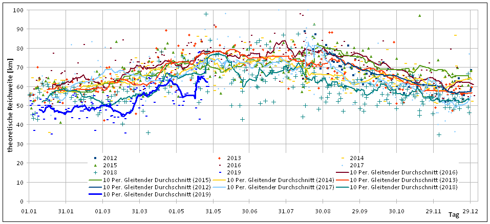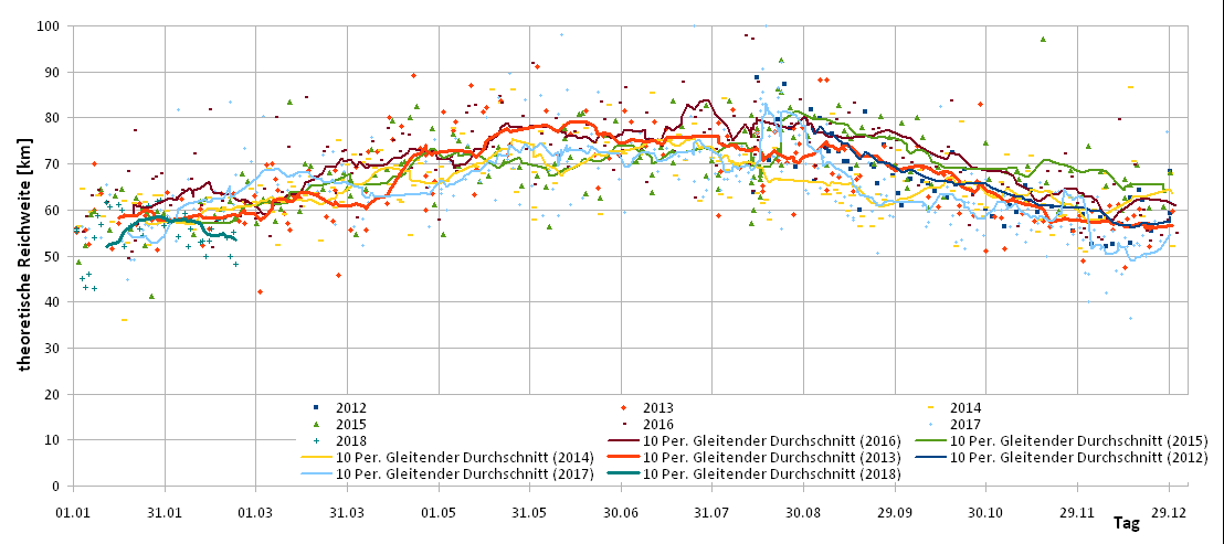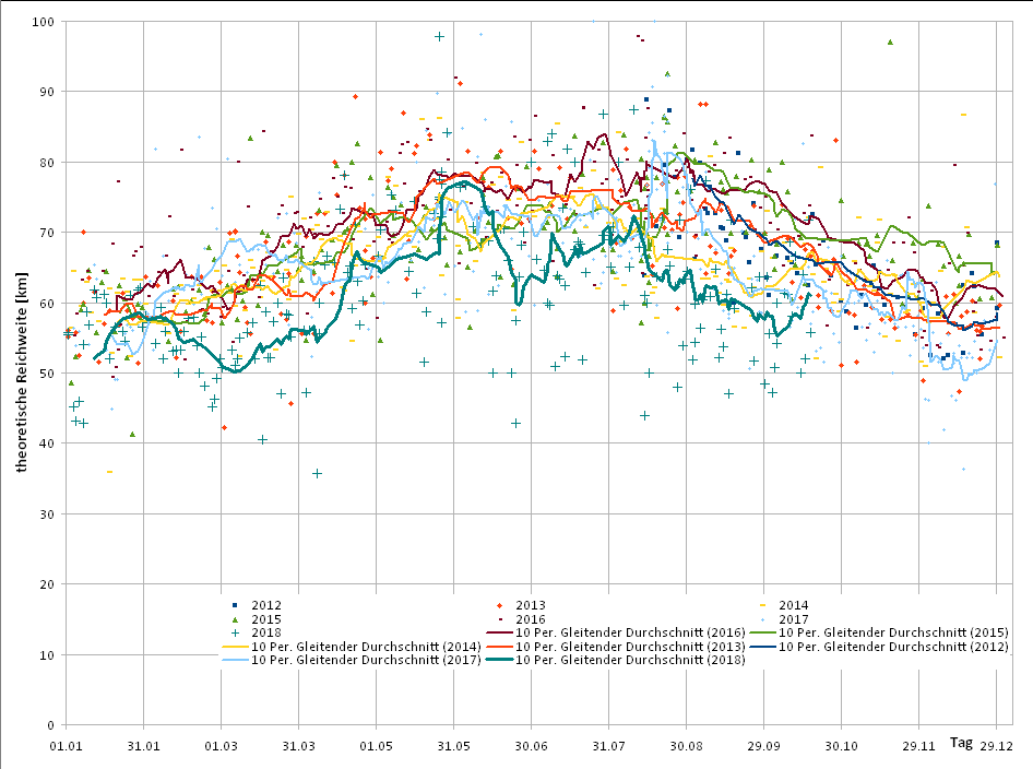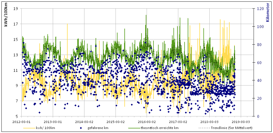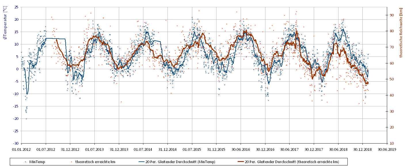 Im Diagramm Reichweite und Temperatur ist auch das deutlich zu sehen, was ich im Juni 2018 schon einmal gezeigt hatte.