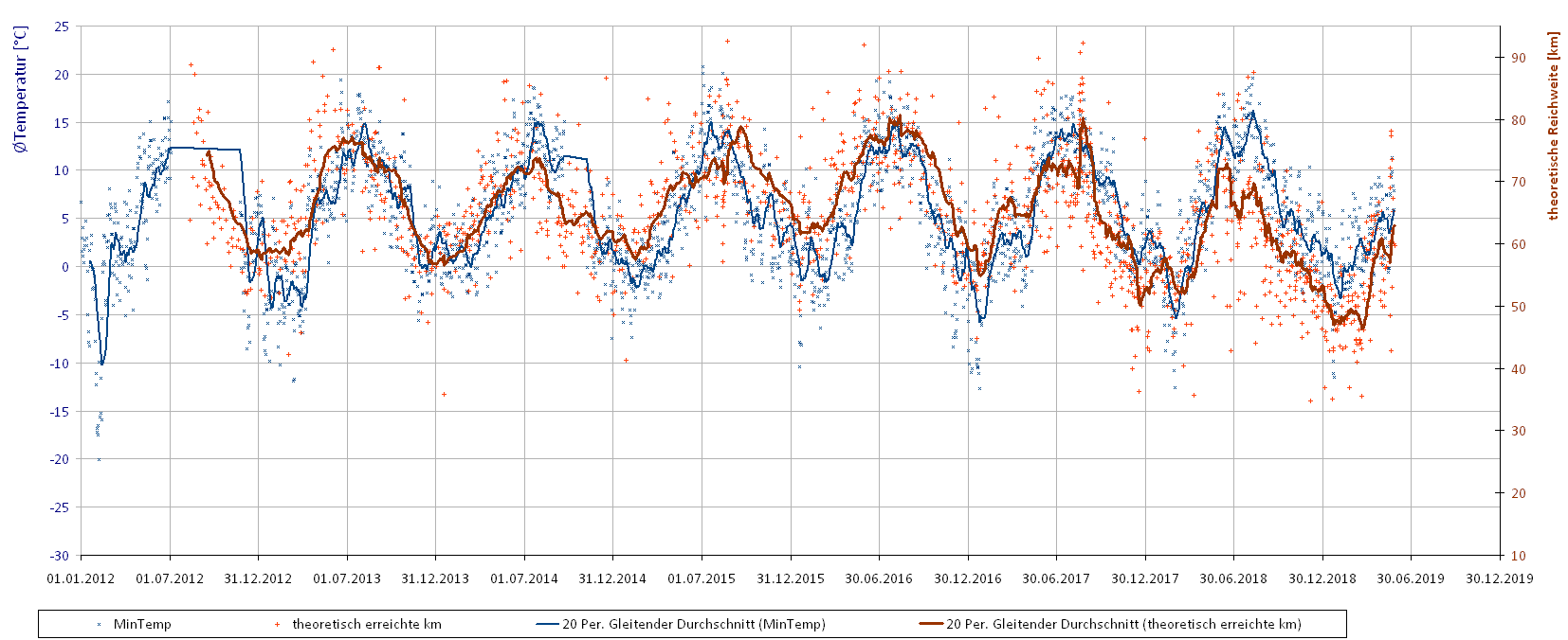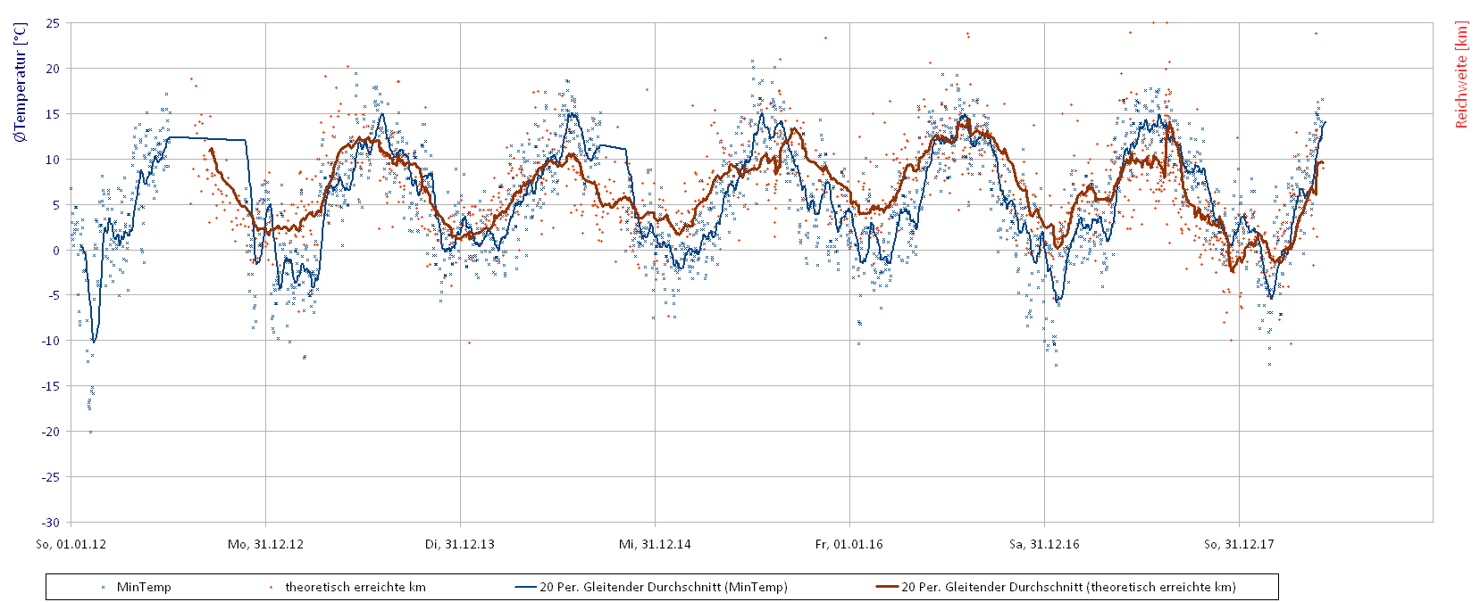 Im Vergleich mit den täglichen Tiefstemperaturen wird dies auch noch einmal deutlich. Die rote Reichweiten-Linie folgt zwar weiterhin dem Verlauf der blauen Temperatur-Linie, aber halt mit deutlichem Abstand.
