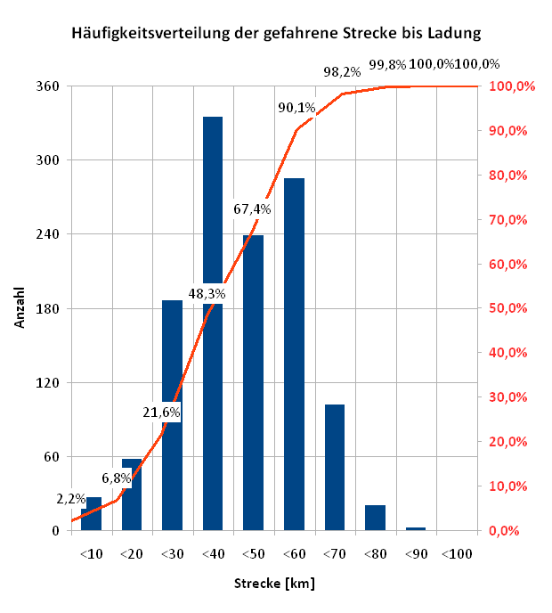 Das spiegelt sich auch wieder im Diagramm der gefahrenen Strecke bis Ladung. Im Mai 2017 war der Schwerpunkt noch bei Fahrleistung zwischen 50 und 60 Kilometer, heute liegt der Schwerpunkt bei 30 - 40 Kilometer.