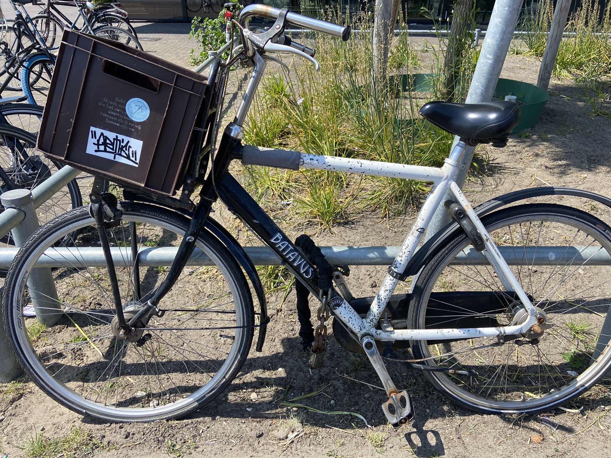 Echte Amsterdamer brauchen diesen Schickschanck nicht. Amsterdamer achten darauf das ihr Fahrrad bei anderen keinen Besitzdrang auslöst. Die zusätzliche Sicherung mit einem massivem Schloss kann aber trotzdem nicht schaden. Schutzausrüstung wie Helm wird konsequent abgelehnt, Helmträger sind 100%tig Touristen. Hier ein typisches Amsterdamer Bike.