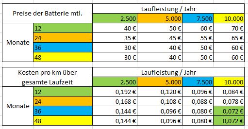 Formel = (Monate * mtl. Batteriemiete) / (jährliche Laufleistung * Jahre) = Kosten pro KM über Gesamte Dauer und KM