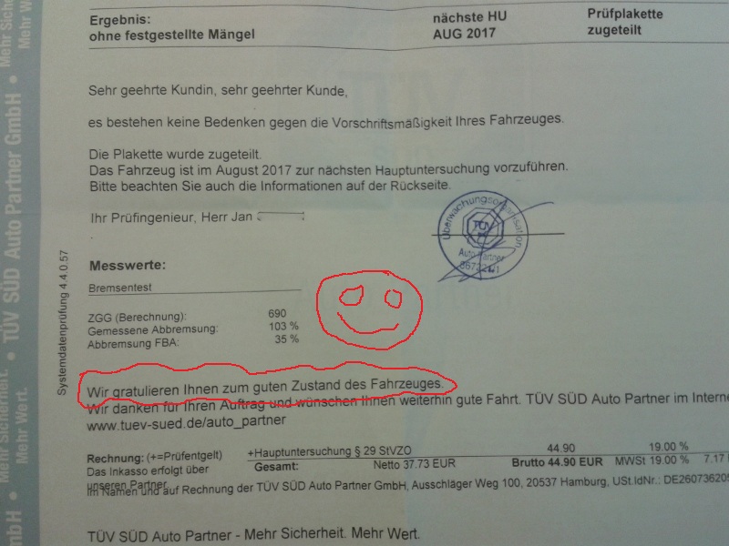 Hinzu kommt, dass laut Fahrzeugschein schon im August 2014 die erste HU fällig gewesen wäre. Habe es immer versäumt das bei der Zulassungstelle korrigieren zu lassen. Mit einem freundlichen Hinweis auf diese Problematik war der Prüfer sehr einsichtig und hat die Plakette für 2017 erteilt.
