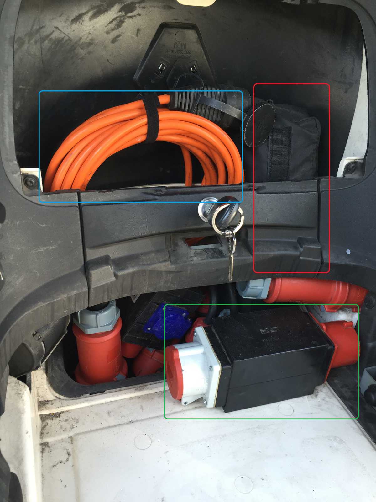 Immer im "Kofferraum" - dh, Gepäck ausladen, richtiges Kabel raussuchen, restliche Adapter wieder reinstopfen, Gepäck einladen, Ladezeit verbringen, Gepäck ausladen, Kabel wieder einpacken, Gepäck einladen, weiterfahren? - Optimistisch: