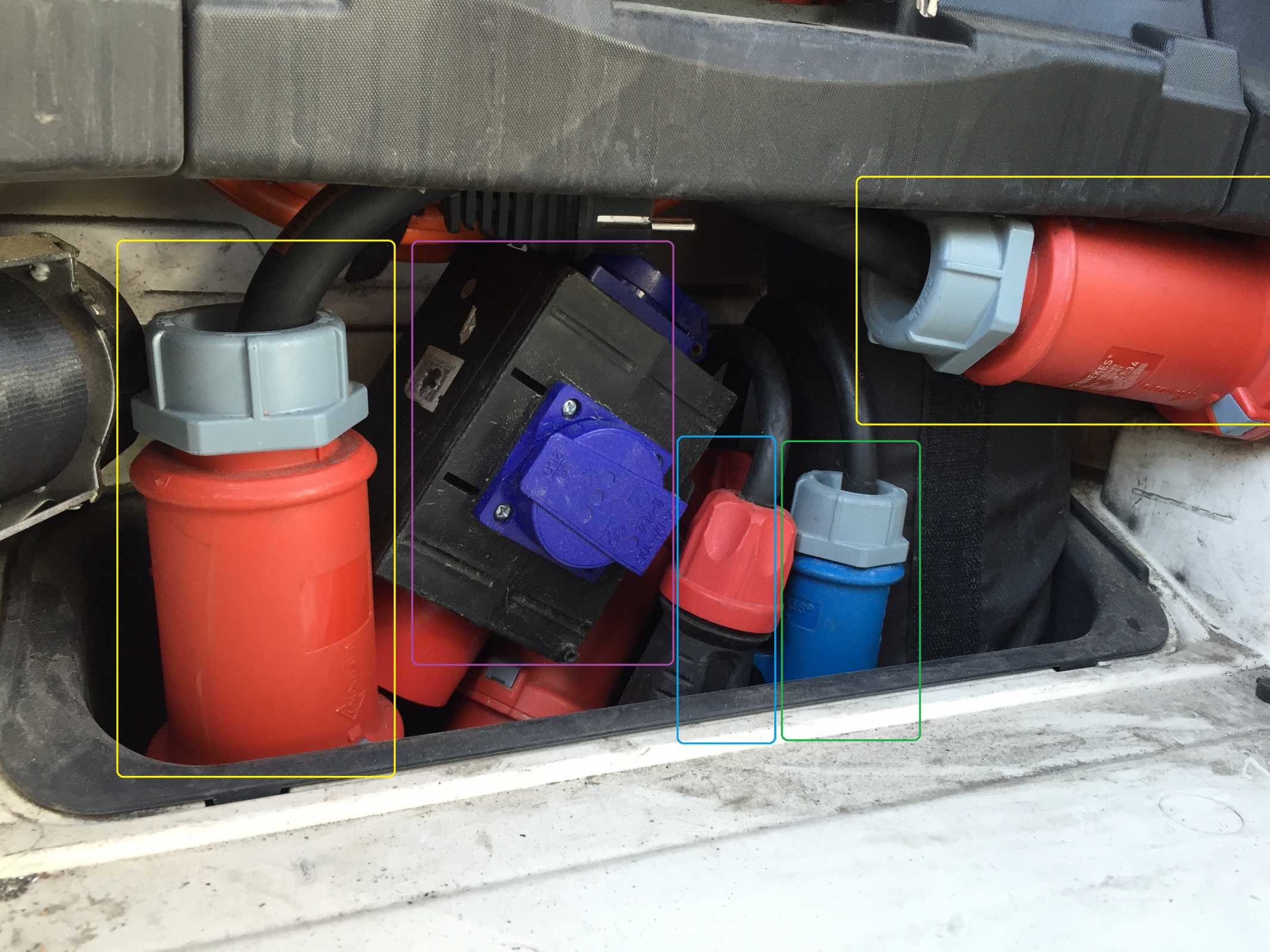 Wenn es auf Tour geht, liegt mein Adaptersammelsurium (ich komm vom 63er CEE mit 3 bis 4 Adaptern bis runter auf Schuko) griffbereit oben in der Reisetasche.