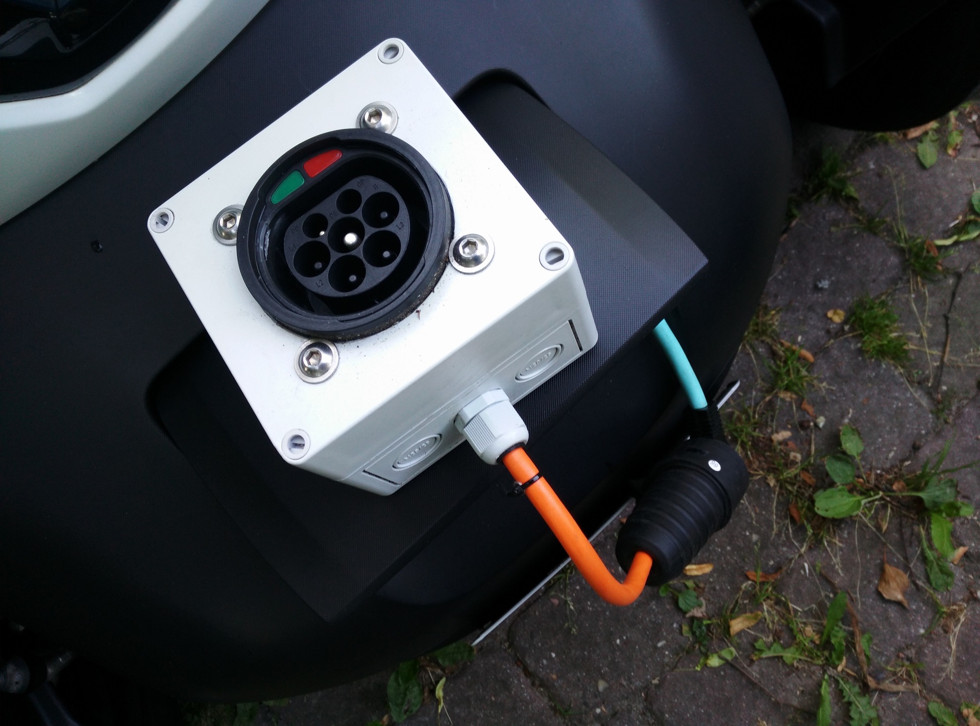 Adapter von CEE blau im Handschuhfach rechts (wird auch zuhause benutzt).